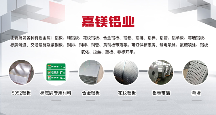 嘉鎂鋁業(yè)(上海)有限公司主要批發(fā)各種有色金屬:鋁板、純鋁板、花紋鋁板、合金鋁板、鋁卷、鋁排、鋁棒、鋁管、鋁單板、幕墻鋁板、標牌滑道、交通設施及紫銅板、銅排、銅棒、銅管、黃銅板帶箔等。可訂做標志牌、靜電噴涂、氟碳噴涂、鋁板氧化、拉絲、剪板、非標開平。公司的優(yōu)質產品在多個行業(yè)中均有發(fā)揮優(yōu)良的性能,表現極佳,廣泛應用于航空、汽車、船務、電子、醫(yī)療等行業(yè)...
